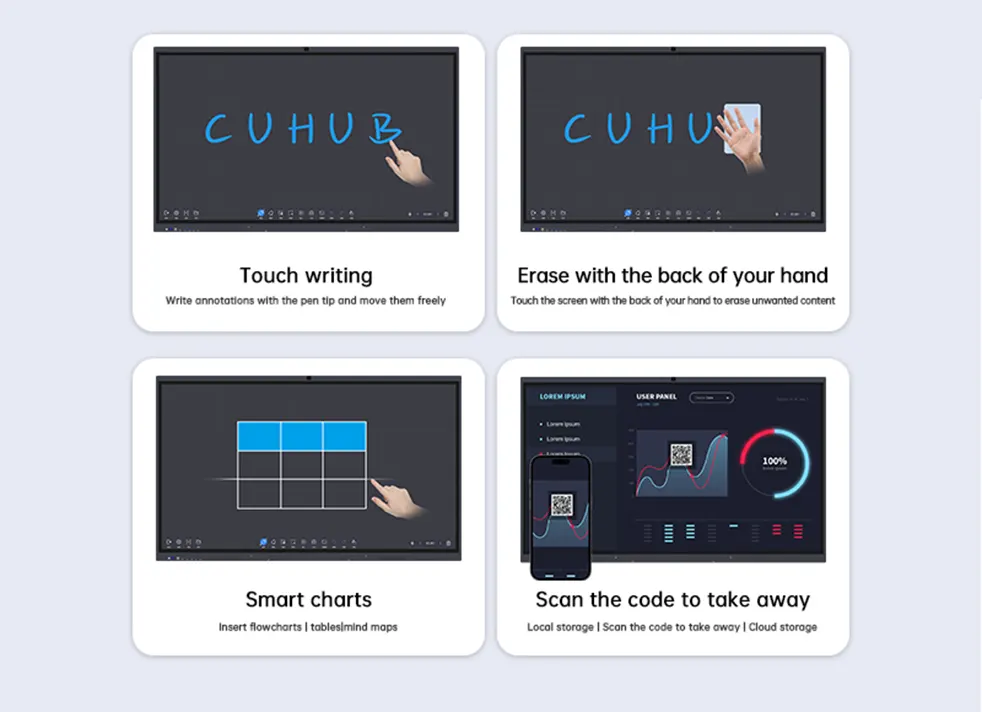 As a leading interactive display supplier, CUHUB delivers the ultimate Smart Board featuring infrared touch technology—an all-in-one solution that replaces multiple devices to streamline your tech stack and maximize productivity. Built for conferences, training, education, and commercial exhibitions, this Infrared Touch Smart Board performs seamlessly in boardrooms, schools, and retail spaces. Order now to experience seamless collaboration in your workspace.