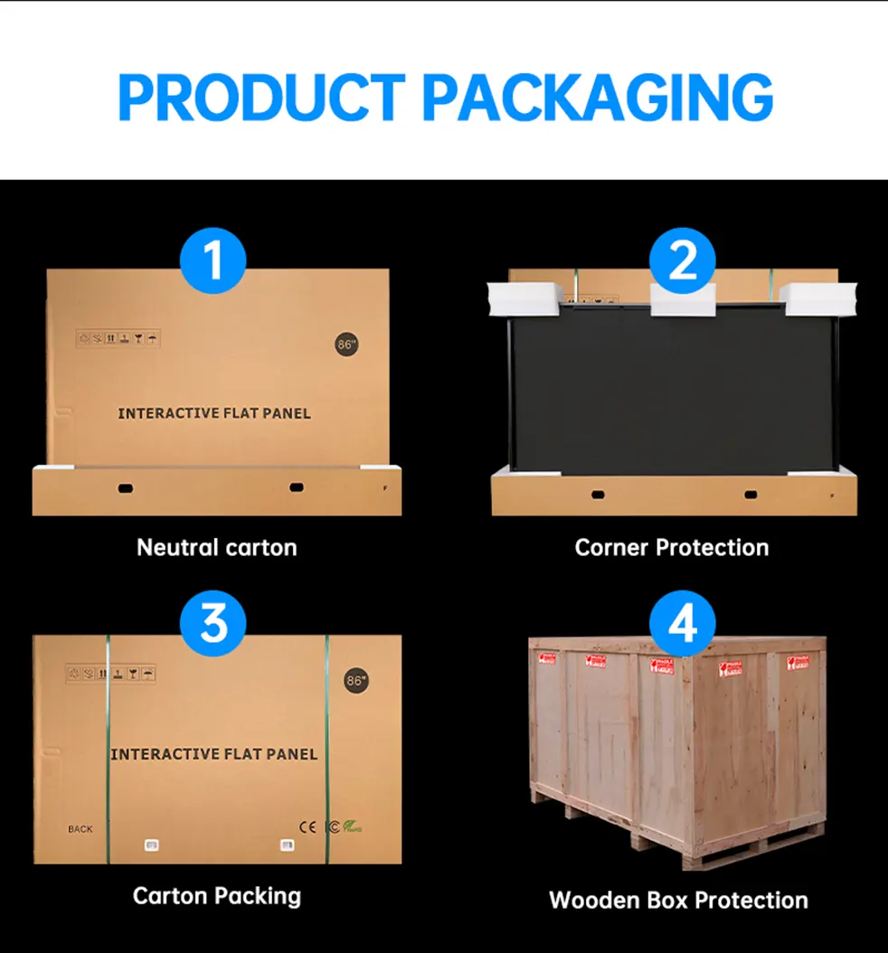 The Smart Board is securely packed in a neutral carton with reinforced wooden box protection for safe transport.