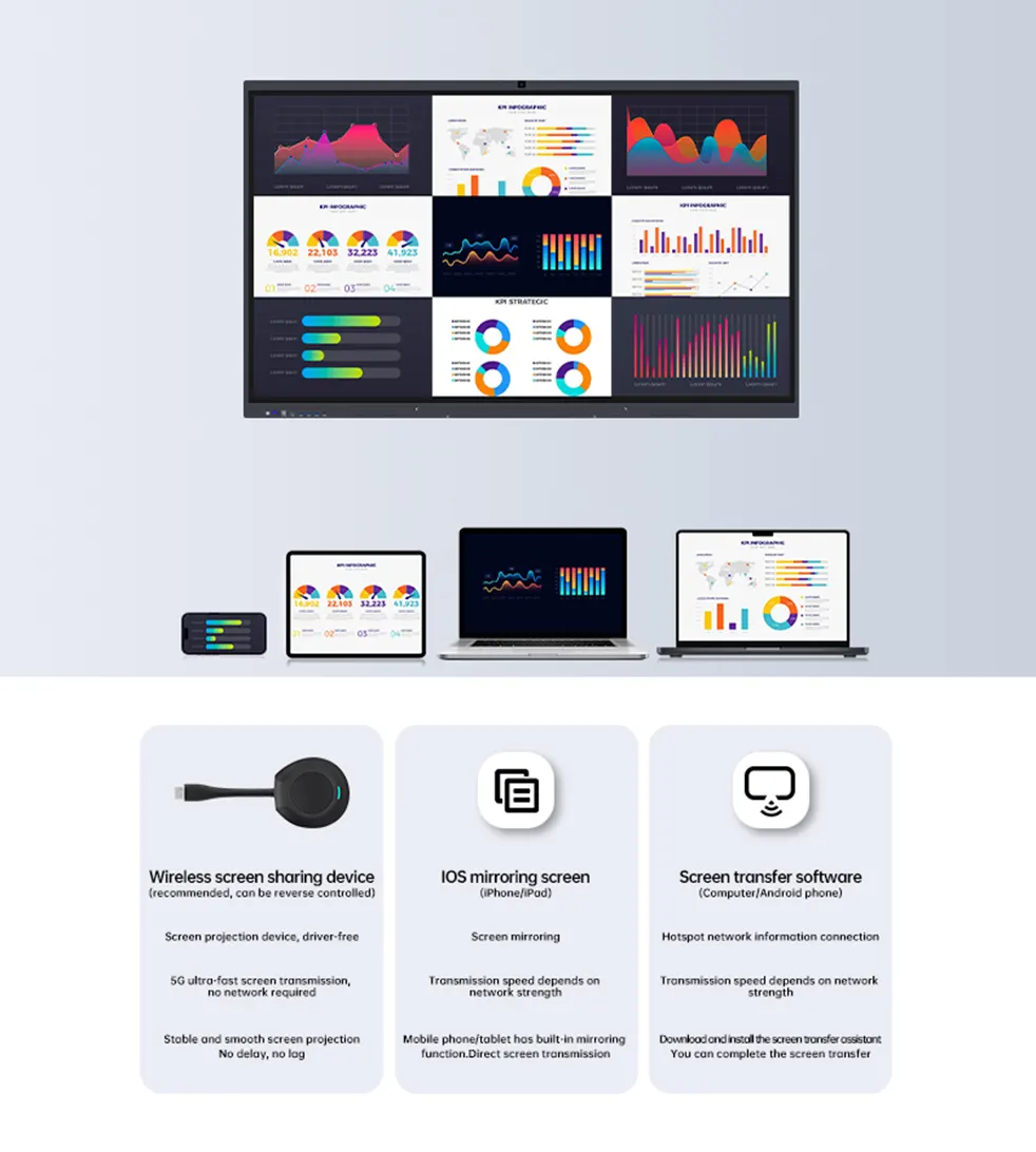 The Smart Board supports simultaneous wireless screen casting from multiple devices, enabling screen mirroring, reverse control, video playback, music streaming, and document sharing.
