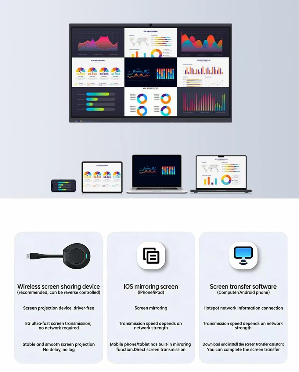 Supporting 2.4G/5G dual-band WiFi, the Interactive Flat Panel Display with Camera enables wireless screen sharing from multiple devices simultaneously.