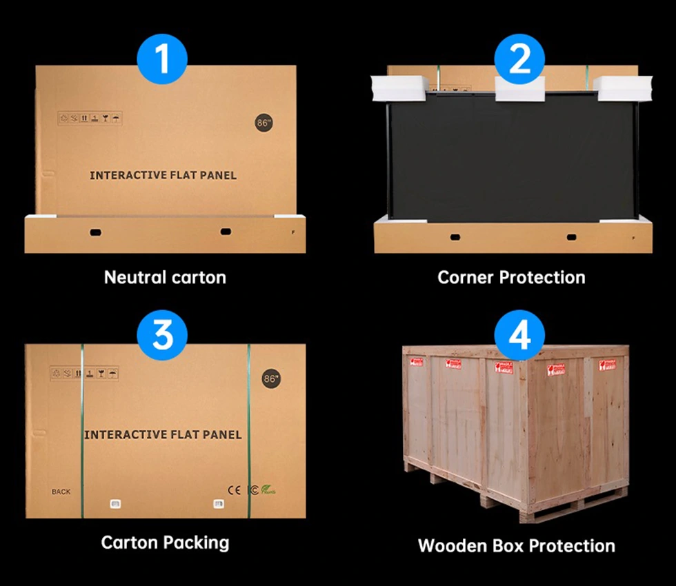 The interactive display is securely packed in a neutral carton with reinforced wooden box protection for safe transport.