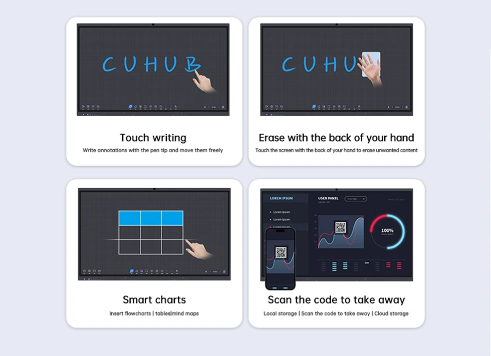 Cuhub is a professional manufacturer and supplier of smart board interactive displays. With its own factory and strong R&D capabilities, Cuhub produces high-quality, versatile, and affordable products. These products are widely used in interactive scenarios such as education, conferences, and healthcare. Visit the Cuhub website to order now.