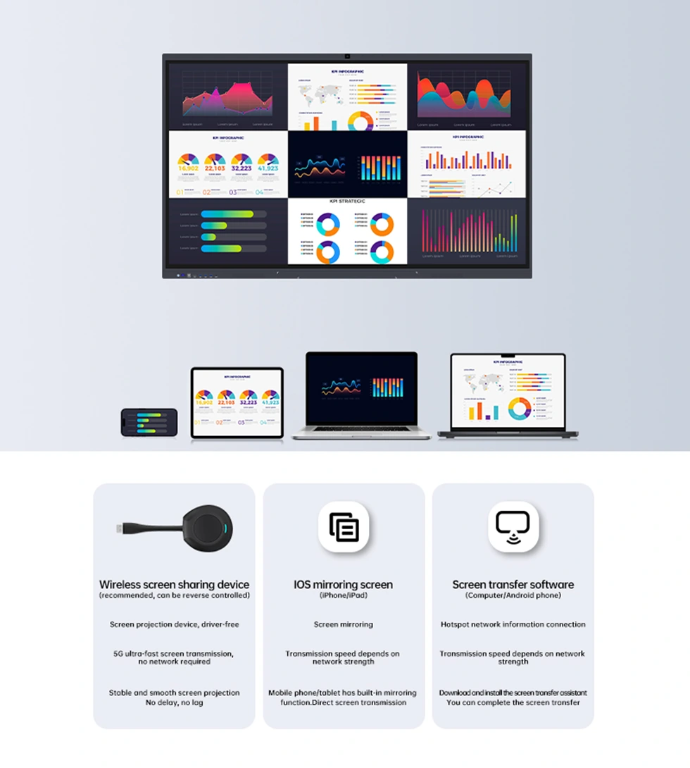 With 2.4G/5G dual-band WiFi, the smart board interactive display enables wireless mirroring across Windows, Mac, iOS, and Android devices.